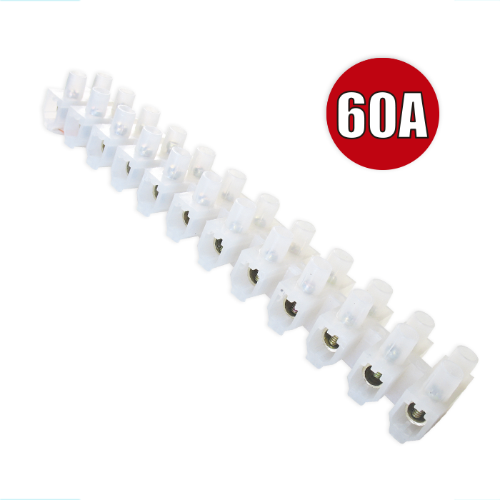 Bornera plastica "PULSAR" 12P 60A 380VAC . Medidas: Largo 19 x Altura 3cm . Conexión de Ø: 6.1mm. Bolsa x 10 / Máster x 200