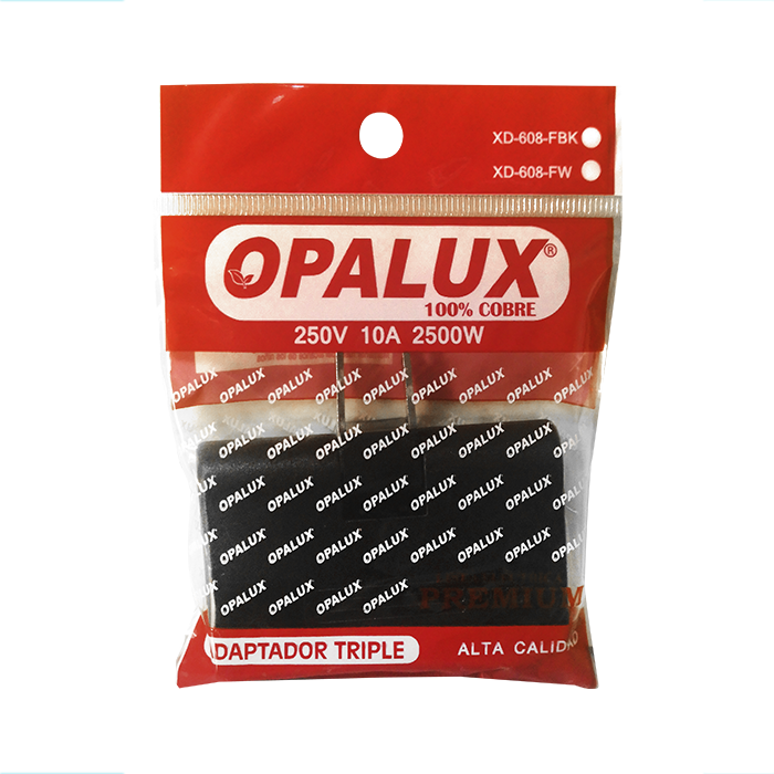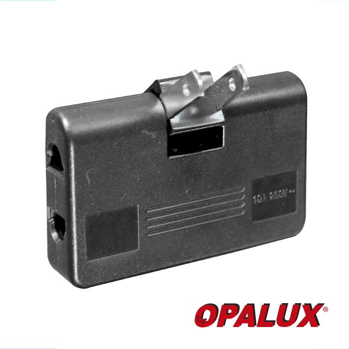 ADAPTADOR TOMA TRIPLE ENCHUFE GIRATORIO PLANO "OPALUX" 2JACK UNIV.1JACK DE COLOR NEGRO 10AMP 250V AC(2P). BOLSAX50. MASTERX300