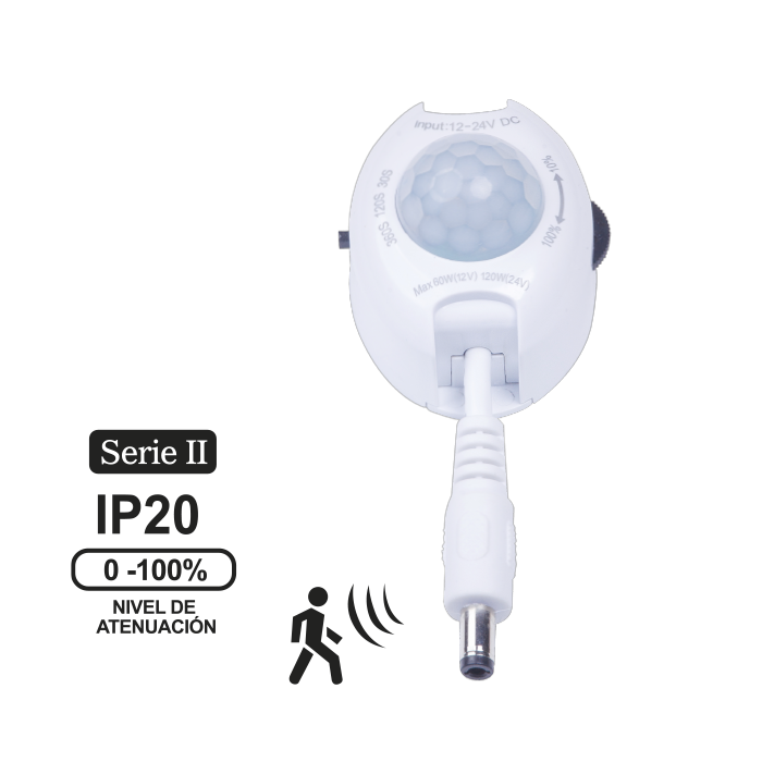 ● Fuente de alimentación: 12-24V DC ● Rango de detección: 120° ● Cargo nominal: LED máx. 60W ● Distancia de detección: 10m ● Luz ambiental: